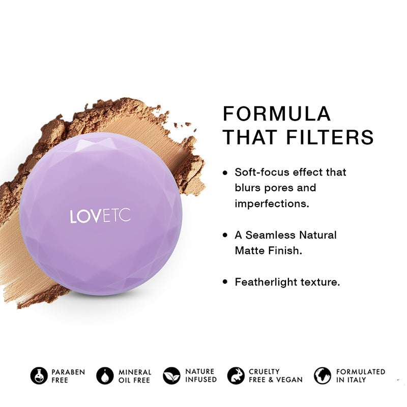 Expertly formulated for a pore-blurring result, the Feather, Flirt, Etc – Filter Finish Compact delivers a skin-refining finish that performs as beautifully as it looks. Created to blend expert performance with effortless application, this pressed powder compact establishes a new level of skin perfection. The soft-focus, natural matte texture diffuses light to blur pores and fine lines while balancing oil and preserving hydration. Hence, this oil-free compact can be considered as essential for both touch-ups and all-day wear. The elegant faceted compact powder, in signature LOVETC lilac hue, is a modern gem, perfect for slipping into your clutch or makeup bag.